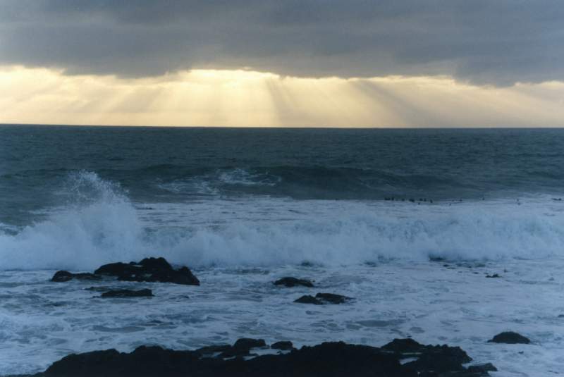 Sunbeams at dusk off coast at Sea Point