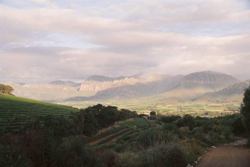 Hawekwas Mountains from Paarl Rock at dusk, with rainbow